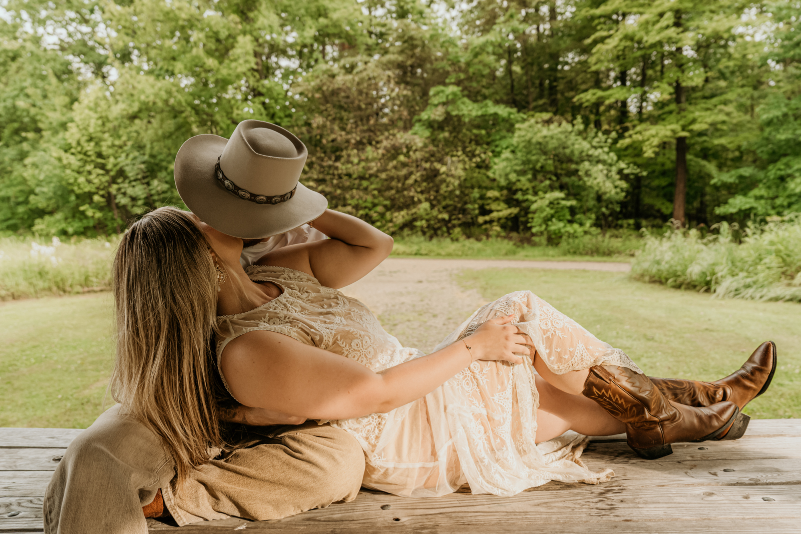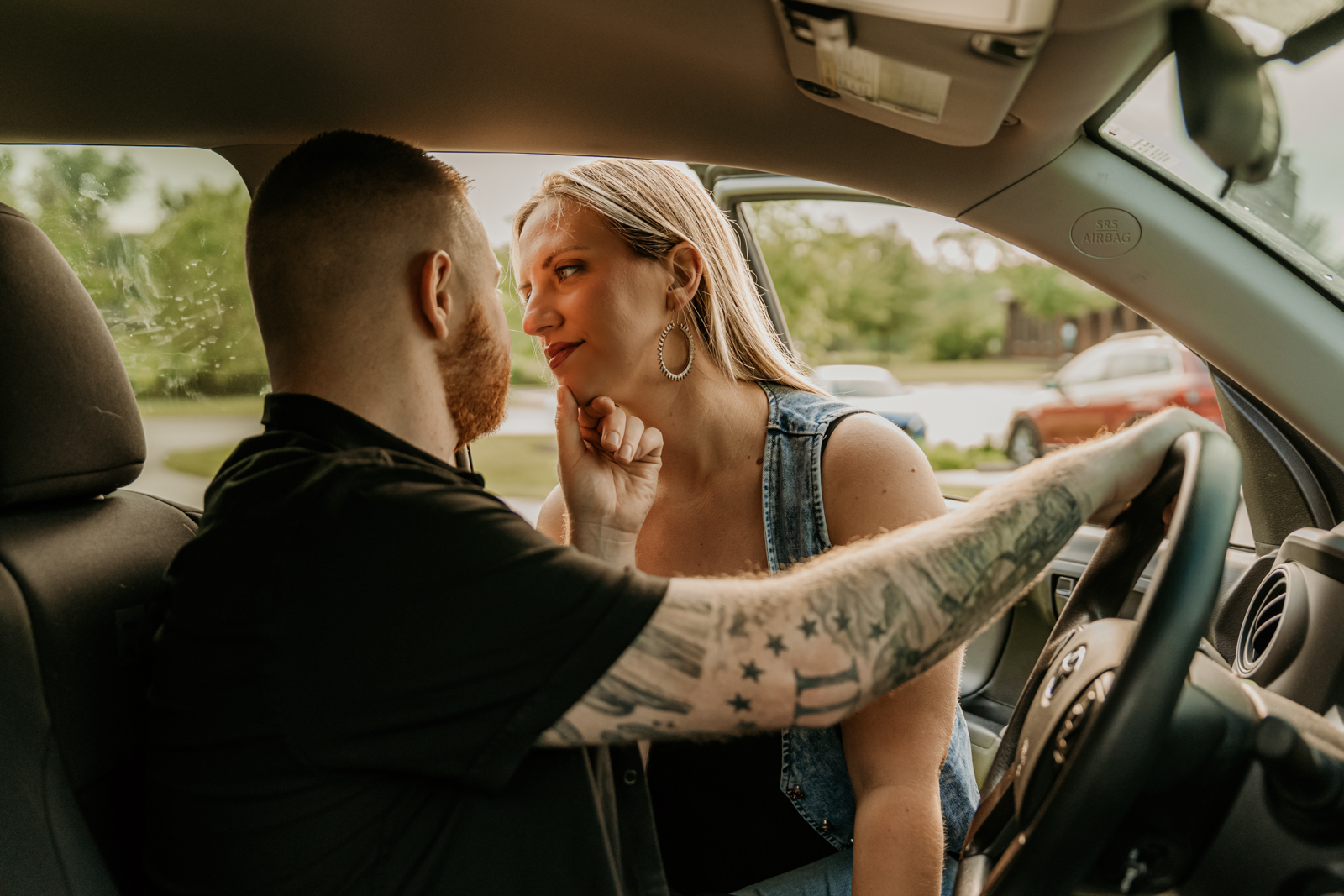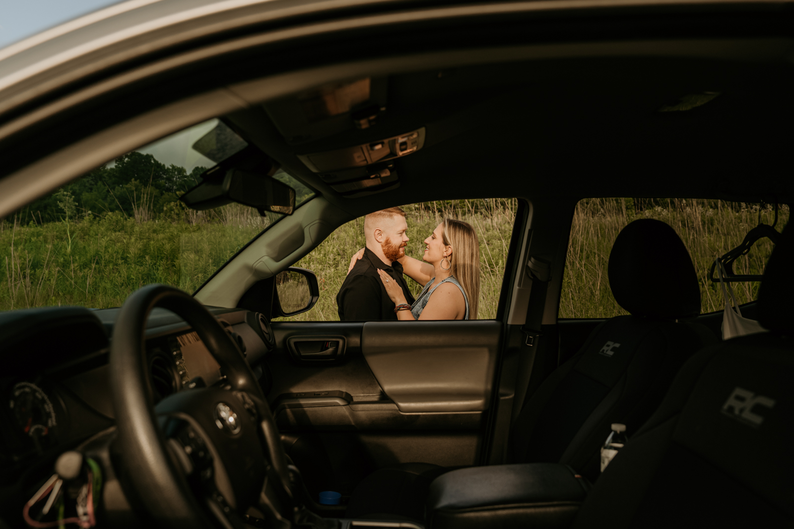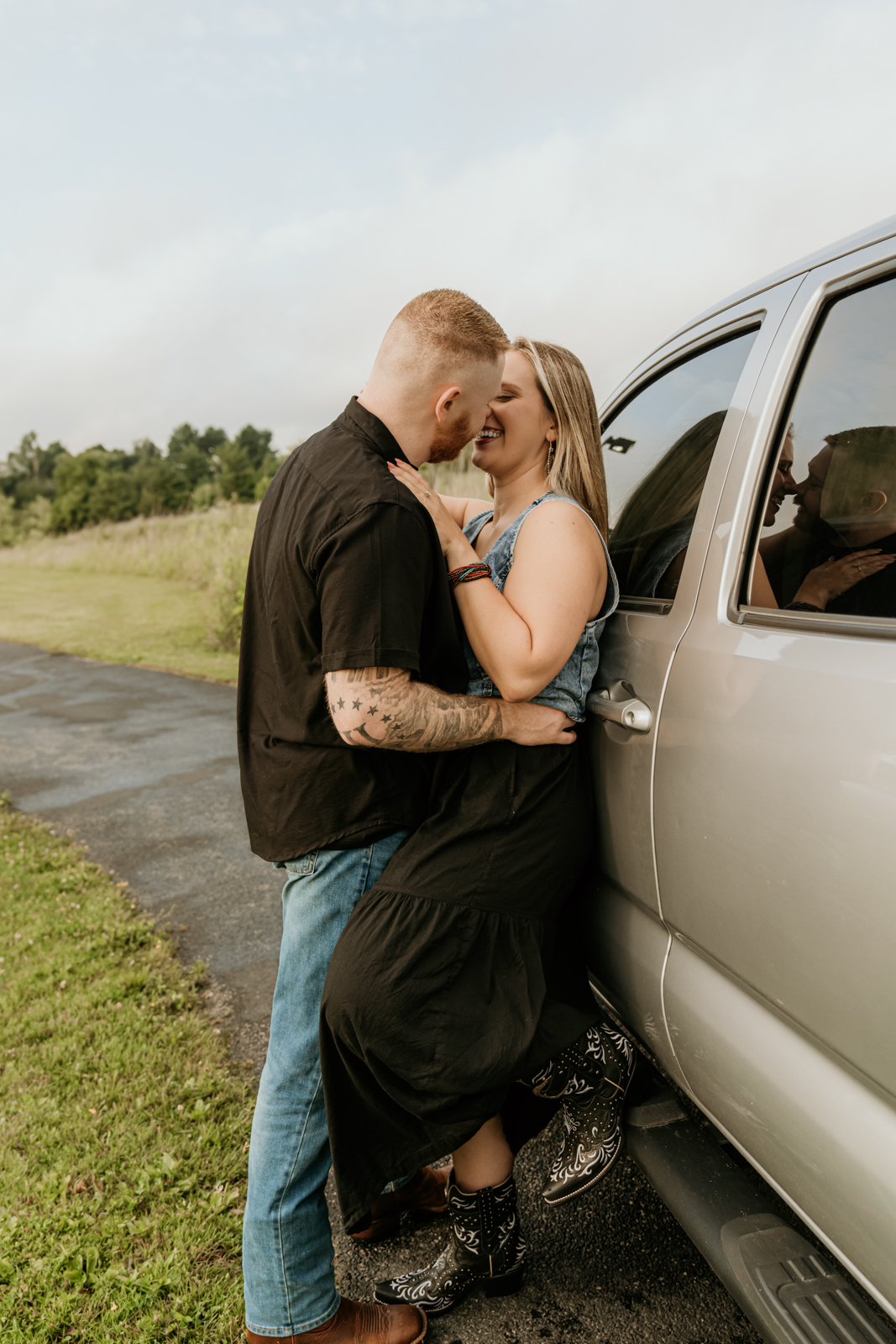 This session was extra special with a fun western twist! Racheal & Tom embraced a charming western style, complete with casual, rustic vibes that perfectly matched the setting. They even hopped inside their truck for some cozy and candid shots, adding a unique and personal touch to their photos. These moments captured their playful, down-to-earth personalities and the strong connection they share.